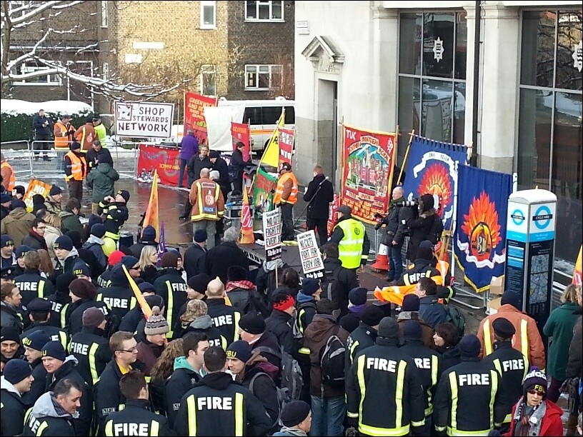 Over 1,000 firefighters shouted, jeered and blew horns outside the head office of the London authority as the fire bosses inside debated whether to close 12 fire stations in London and remove a further 18 engines, cutting 520 jobs and putting the lives of millions of Londoners and visitors in jeopardy.