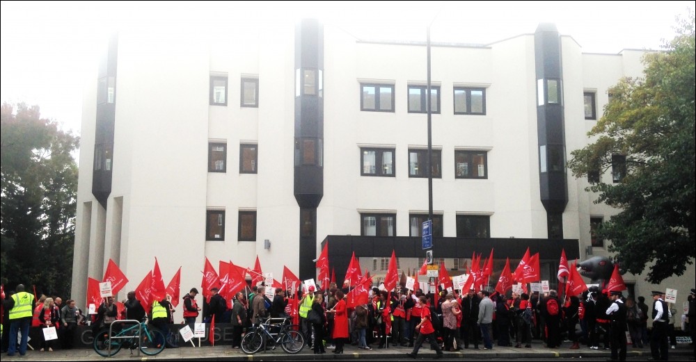 Later in the day strikers decided to pay an impromptu visit to the nearby offices of Shepherds Bush Housing Association where St Mungos Broadway board chair, Paul Doe, is chief executive. Setting off behind the NSSN banner 150 strikers held a noisy protest.