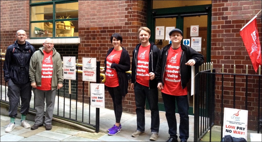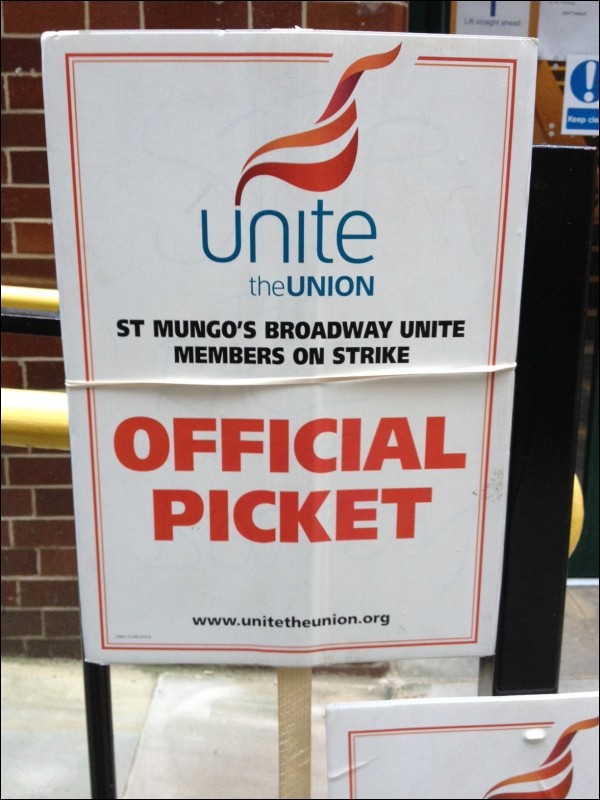 Pickets have been boosted by overwhelming support from passers by. St Mungos volunteers refused to cross picket lines, understanding that decent services to the homeless are threatened by the new chief executive Howard Sinclair.