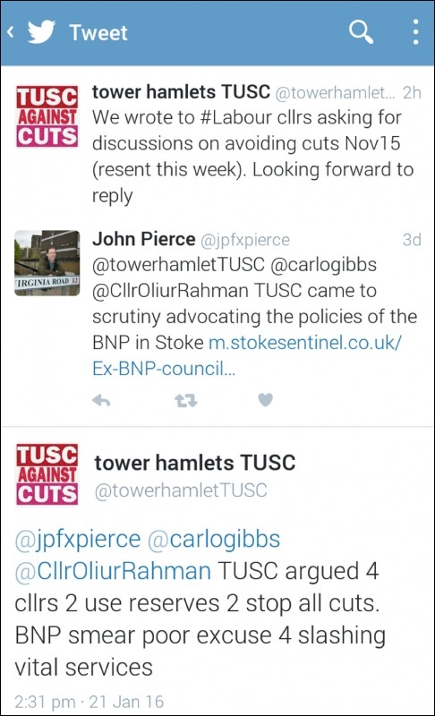 I am disappointed Cllr Pierce attempted to smear TUSC as "advocating the policies of the BNP".
