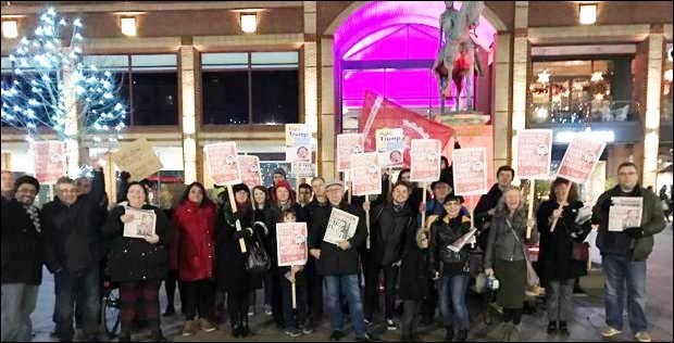 A protest was held in Coventry as part of international demonstrations against the inauguration of Donald Trump as president of the United States. Working class people are standing together in solidarity against the agenda of Trump, which seeks to divide ordinary people.