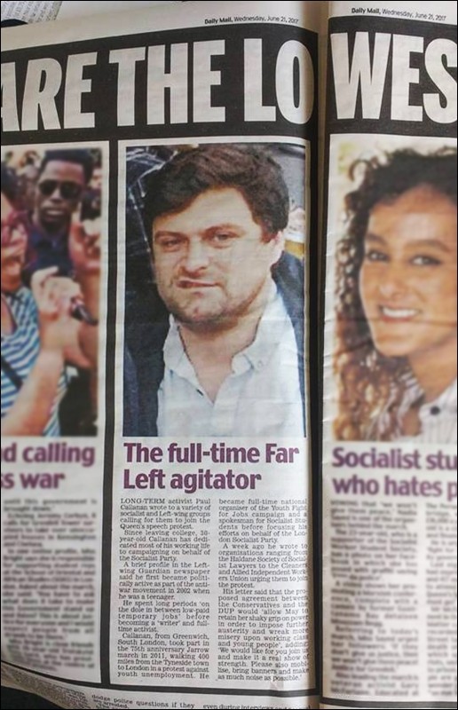 Fanatical right-wing gutter rag the Daily Mail ran a piece on Socialist Party London organiser Paul Callanan on 21 June. Its print headline: "They are the lowest of the low."
