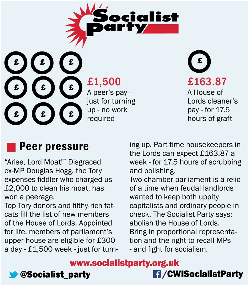 Two-chamber parliament is a relic of a time when feudal landlords wanted to keep both uppity capitalists and ordinary people in check. The Socialist Party says: abolish the House of Lords.