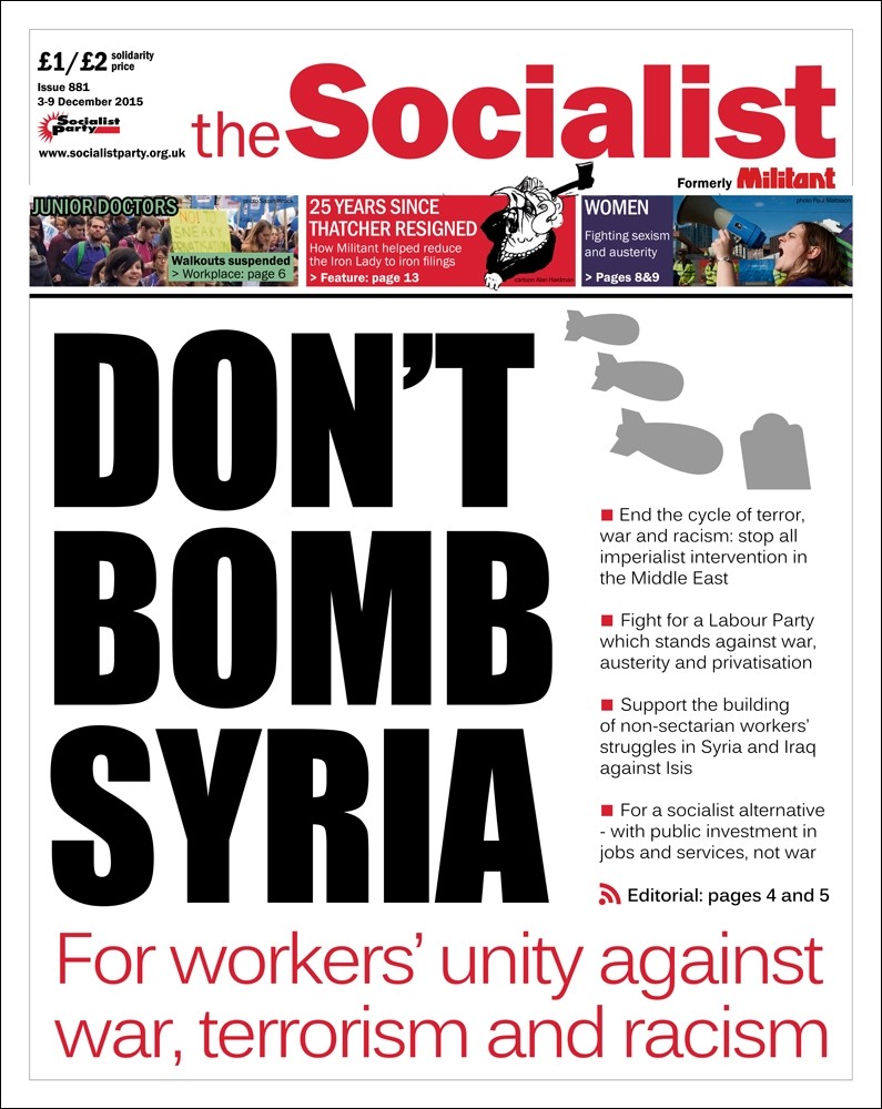 As the Socialist Party argued in last week's issue of this paper, bombing Syria will not stop Isis. Cameron is attempting to use the grief and outrage felt by ordinary people at recent terrorist atrocities - including in Paris, Mali, Beirut, Tunisia and Ankara - to try to build public support for this war.