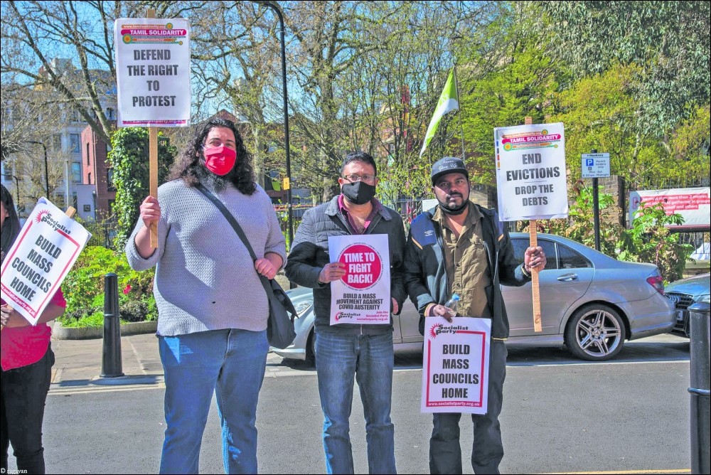 A lively and energetic day of action on housing swept through East London on 17 April. Socialist Party members, Refugee Rights activists, housing campaigners, striking workers and others protested outside and inside the offices of property management firm City Rooms in Stepney Green. The action was called by the Unite housing workers' branch and the Social Housing Action Campaign in response to the housing crisis which has plunged to new depths during the pandemic. The protesters put forward the slogan 'stop the evictions, drop the debts'. At the same time, further protests took place outside offices in Stratford.