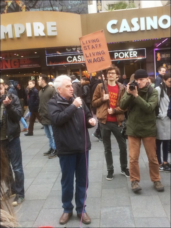 Strikers from Picturehouse cinemas in Brixton, Crouch End, Hackney and Central, gathered in Leicester Square on Saturday 25 February to make a big noise about the way their demands are being ignored. They are mostly young and very angry that their employer, Cineworld, which makes tens of millions of pounds of profit a year, refuses to pay them the London Living Wage (£9.75 an hour) or cover sickness and maternity leave. The company's boss is on £1.2 million - £575 an hour!