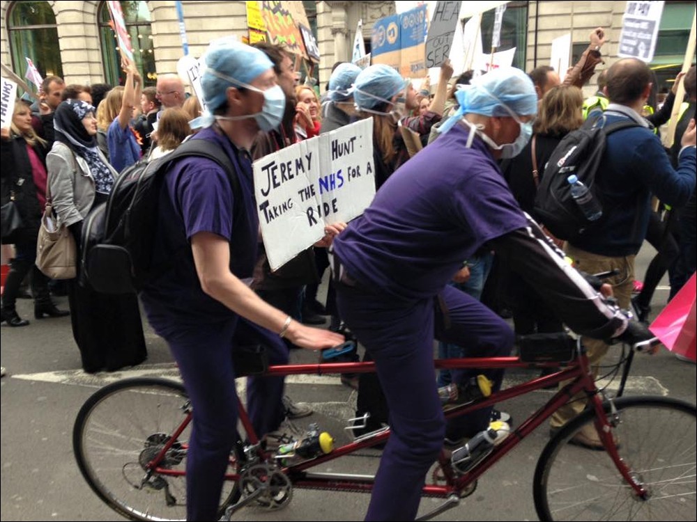 Loud cheers went up for every speaker at the rally who called for defence of the NHS. Thousands on the march chanted "Hunt must go", "NHS! NHS!" - and "BMA! BMA!" The BMA, traditionally a very conservative body, is now seen as an organisation that will fight for the NHS and its workers.