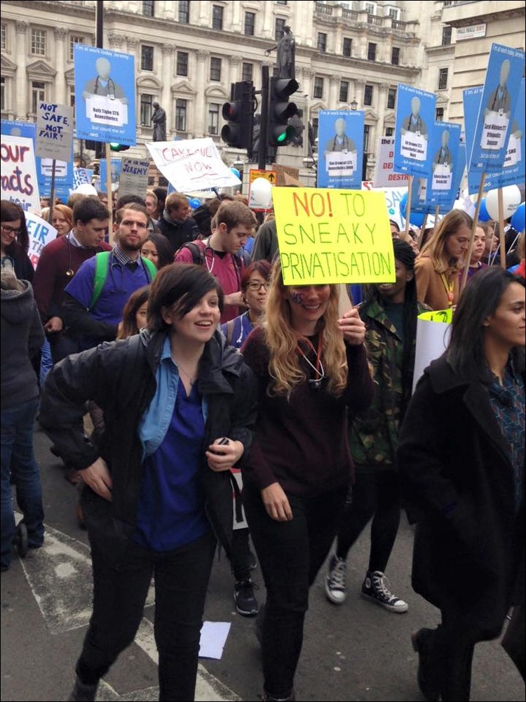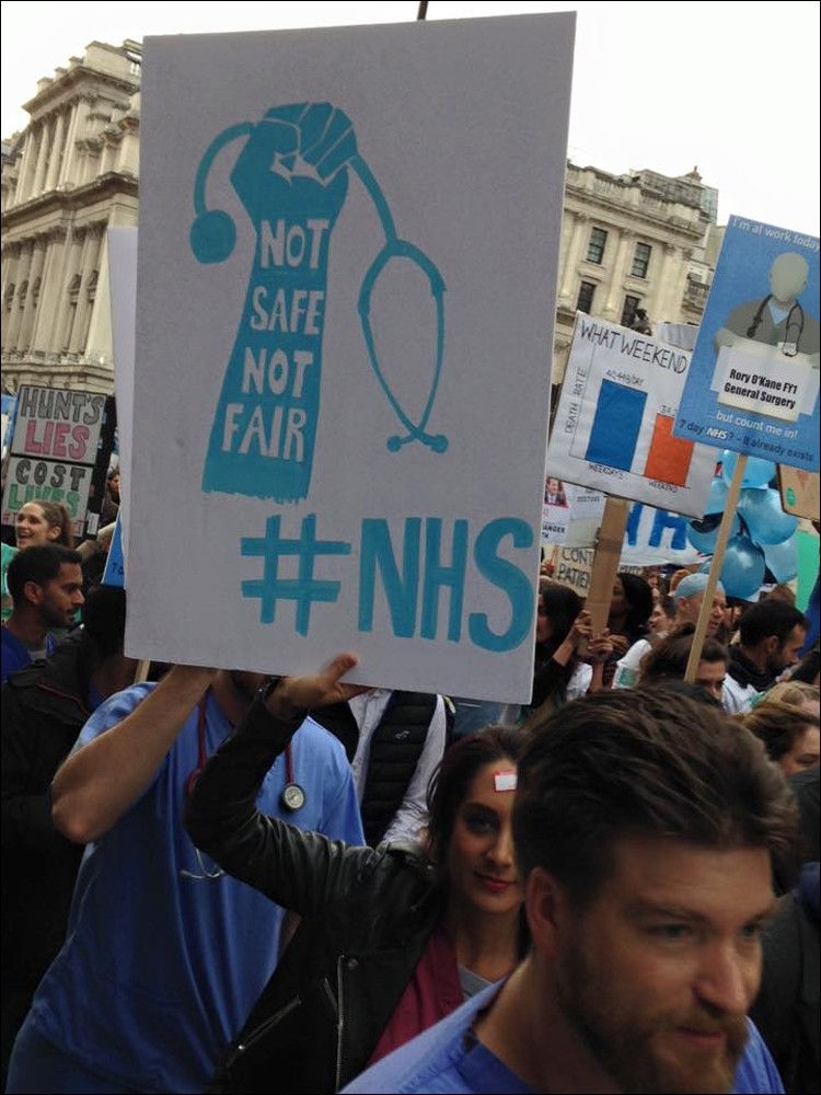 Thousands more wanted to be there. Blue placards throughout the march bore the names of doctors who were working at the time of the demonstration. Hunt's claim that the NHS is not a "24/7" service was proven false.
