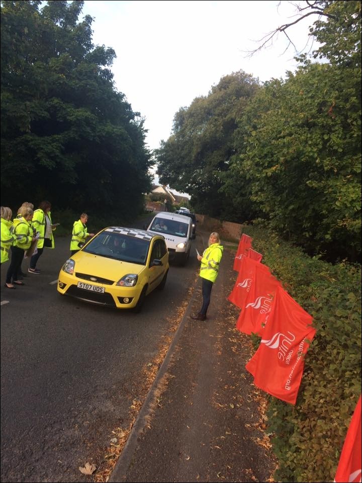 They leafleted workers arriving at the site. The tailback of cars caused huge delays but it was overwhelming smiles and solidarity as 99% took leaflets and gave their support.