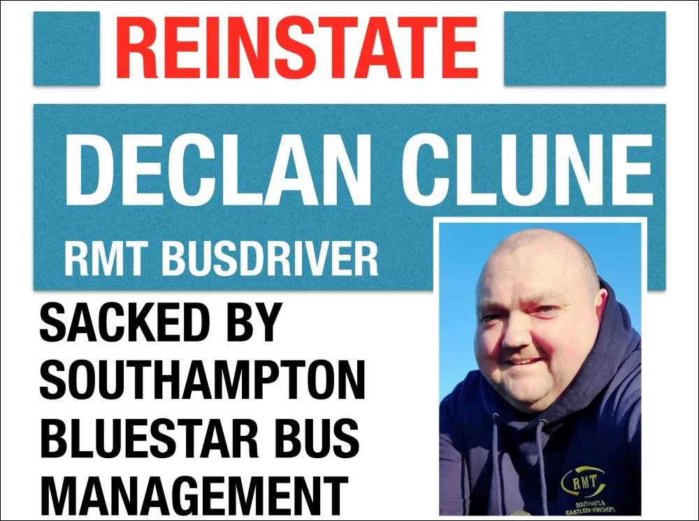 Declan Clune, secretary of the Southampton District Bus and Coach branch of the RMT and a Socialist Party member, was sacked on 26 February by Bluestar Bus company, on the spurious grounds of "bringing the company into disrepute". His crime? In line with health and safety regulations, as branch secretary he reported a bus collision with a railway bridge that the company denies.